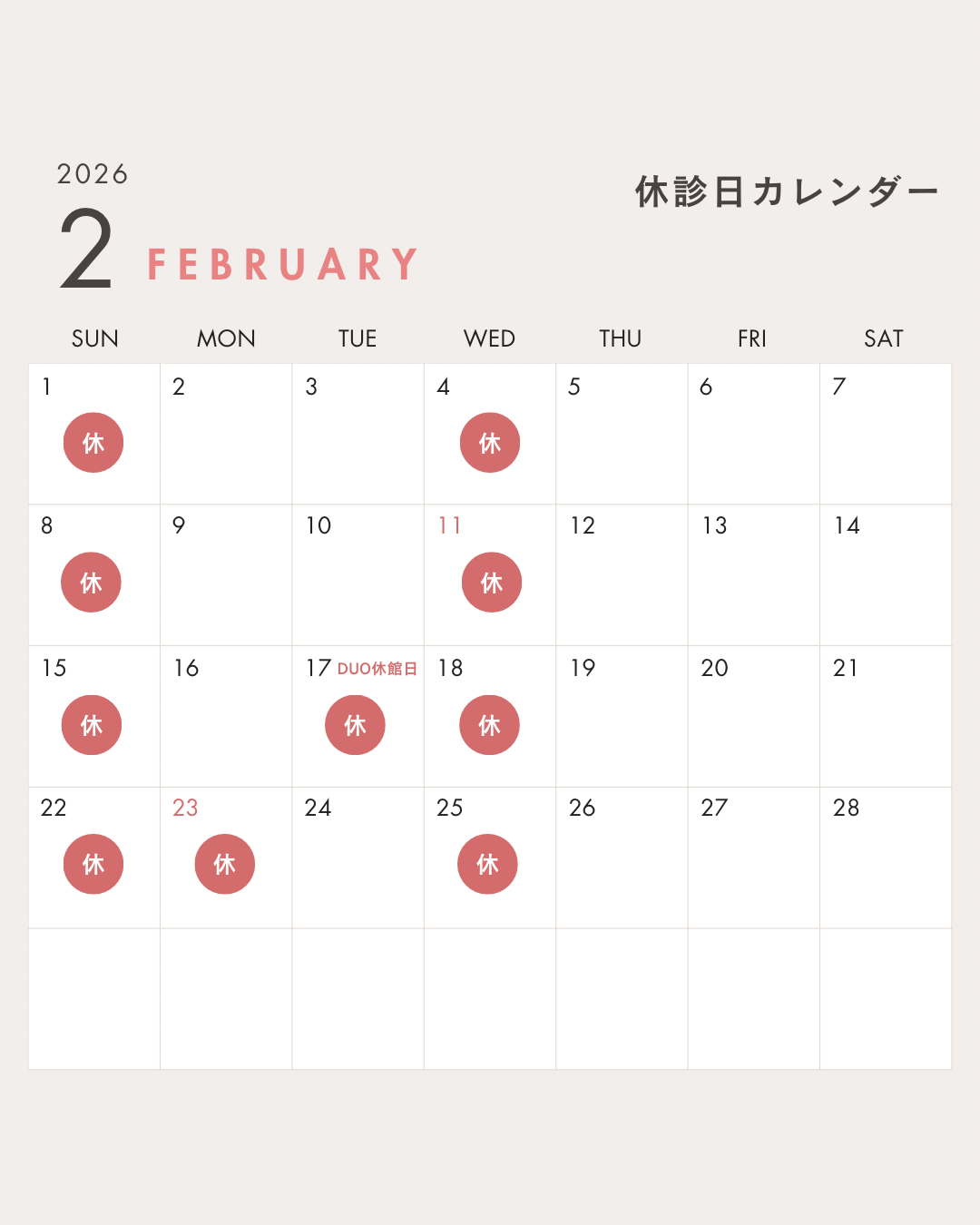水曜日・日曜日・祝日の他、2月17日はDuo休館日のため休診となります。